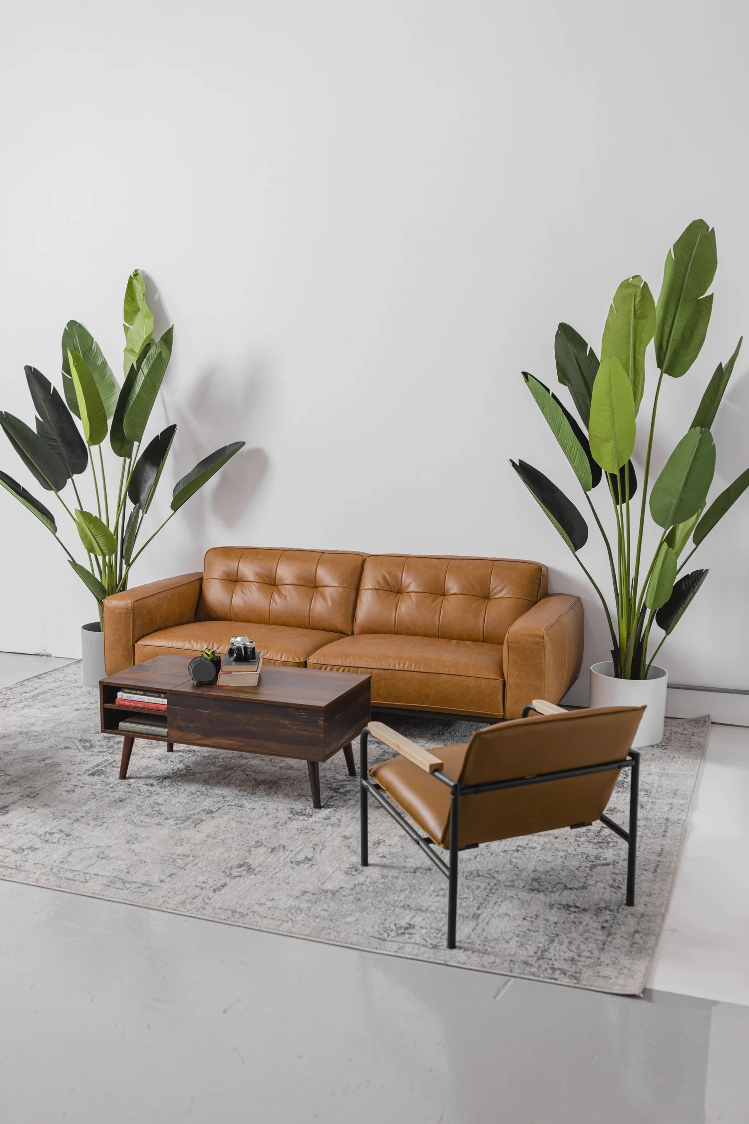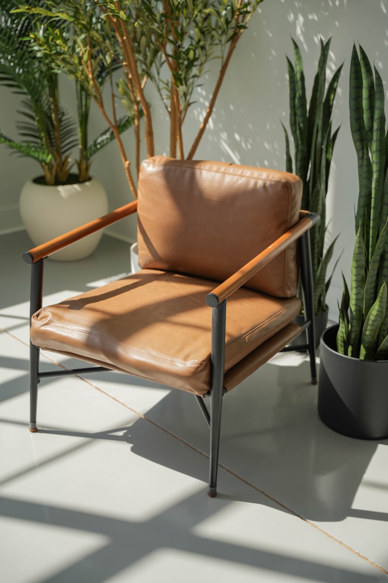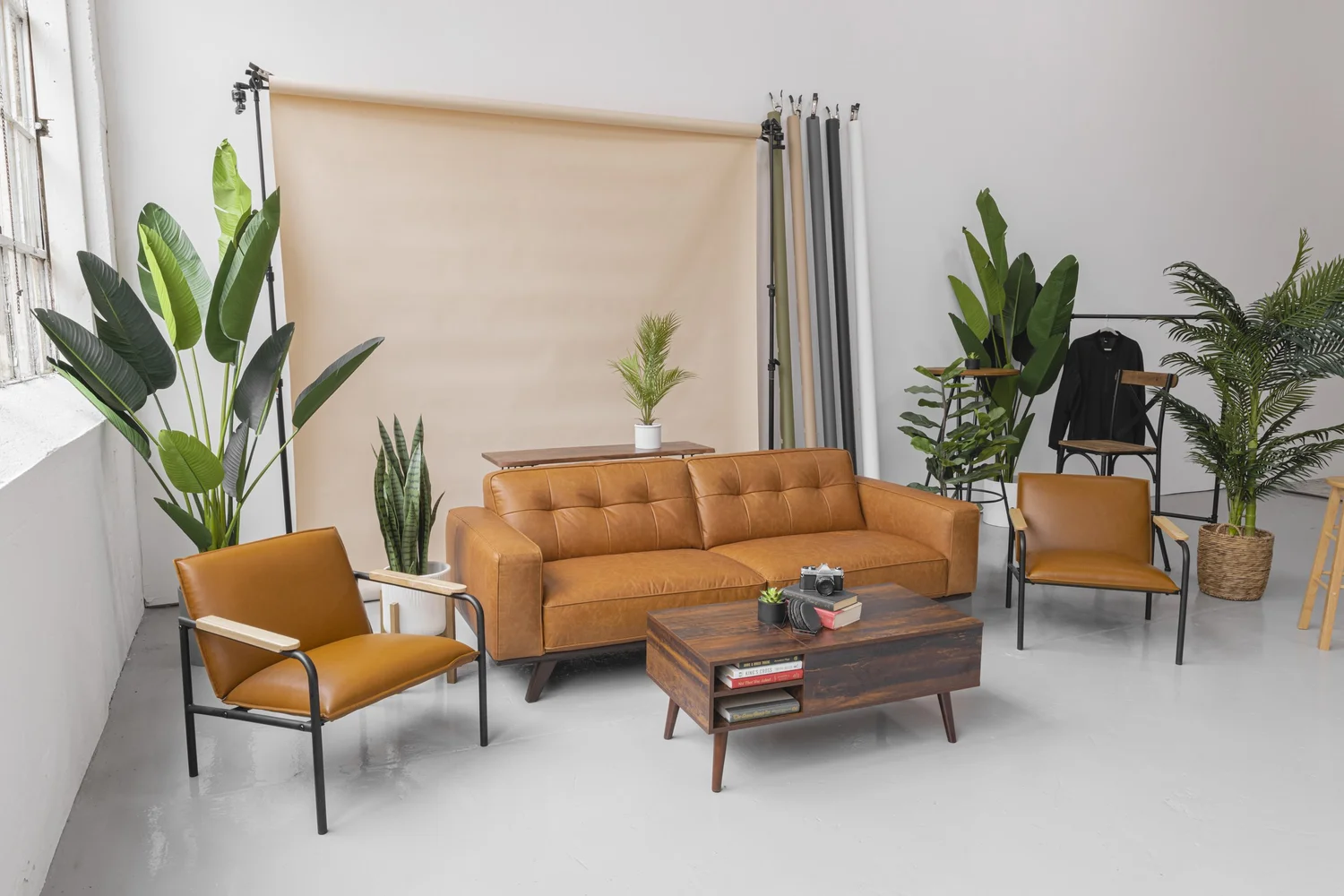 Mid-century leather sofa, accent chairs, coffee table, and plants — included with every Taylor's Mill booking.