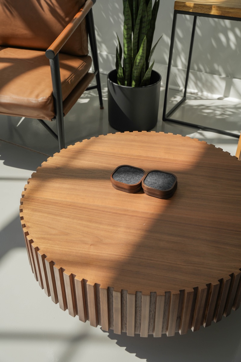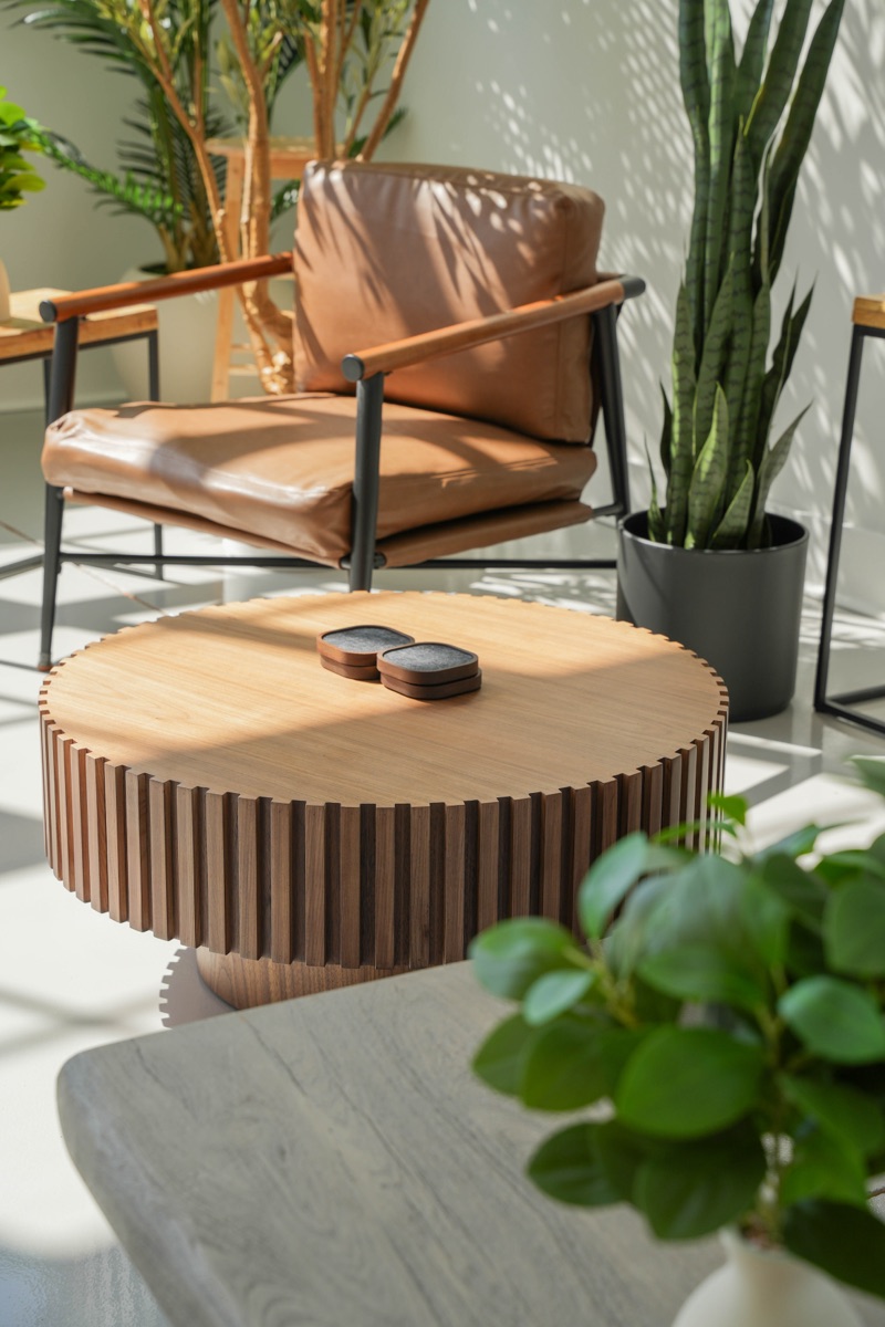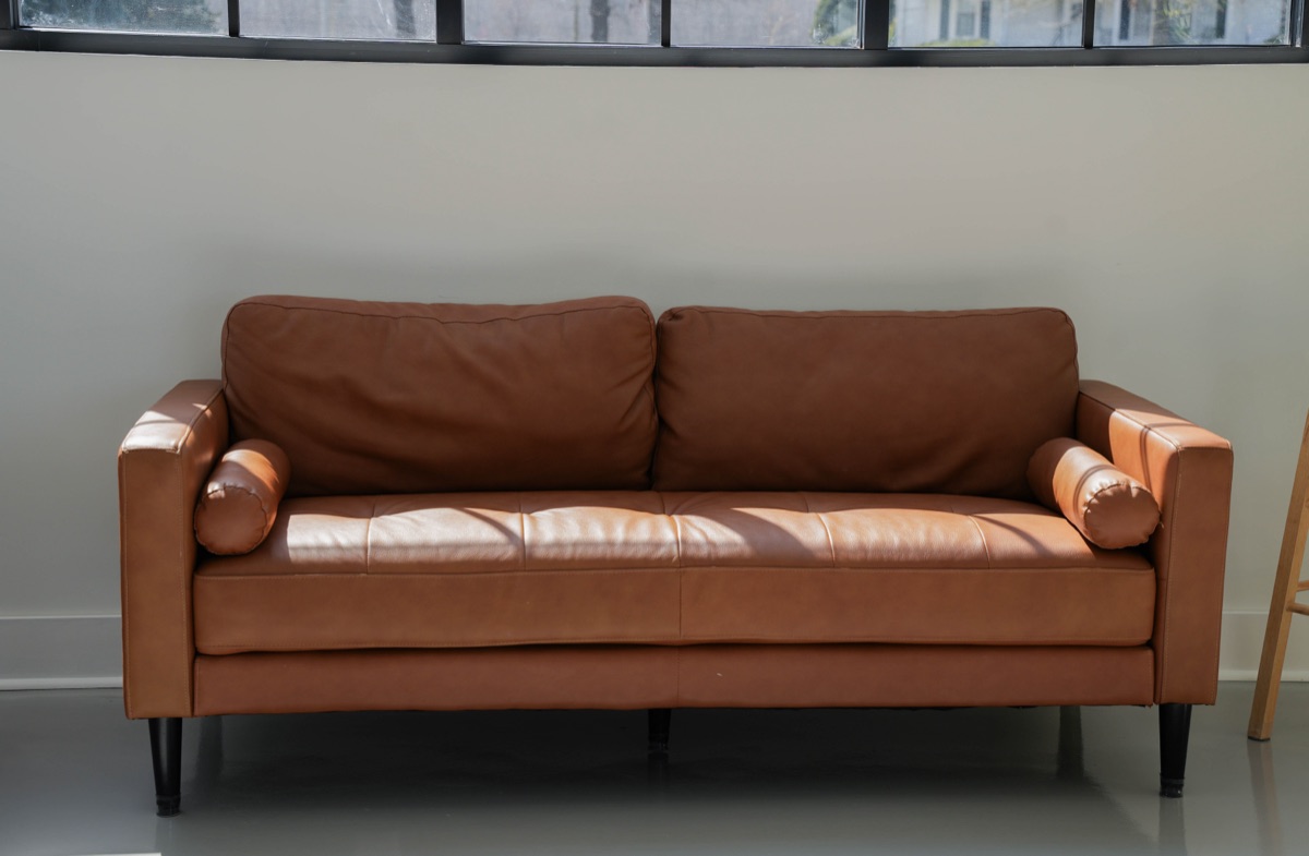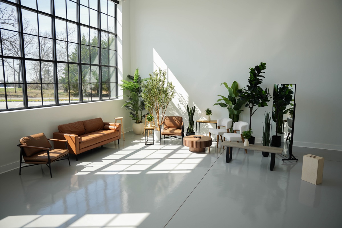 Mid-century leather sofa, accent chairs, coffee table, and plants — included with every Taylor's Mill booking.